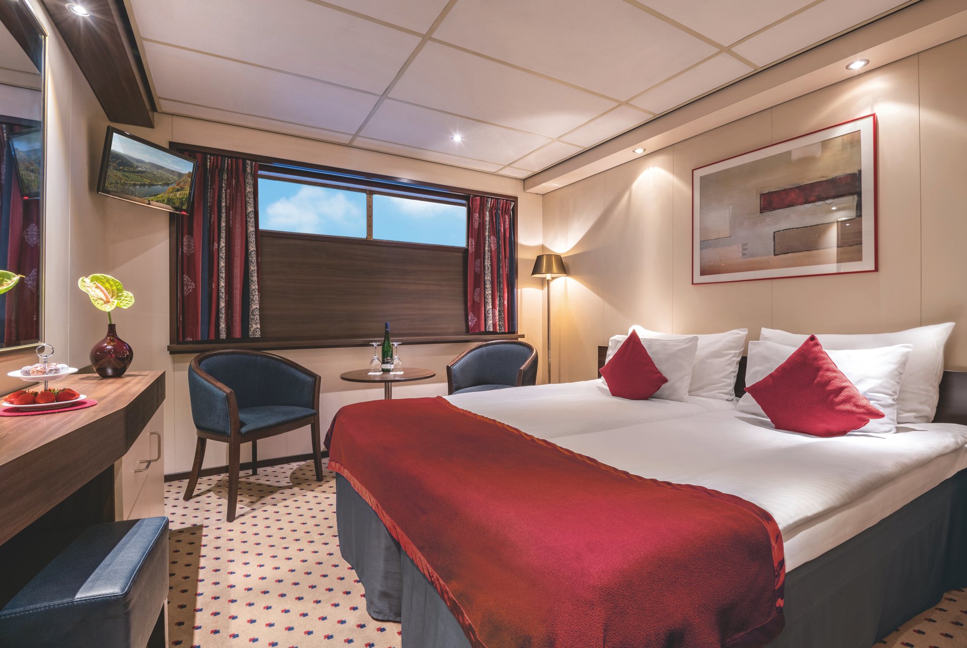 Aussichtsfenster (Öffnen nicht möglich), wahlweise Doppelbett oder zwei Einzelbetten, individuell regulierbare Klimaanlage, geräumiger Kleiderschrank, Flachbildschirm-TV, Dusche/WC, Haartrockner, Telefon und Safe.